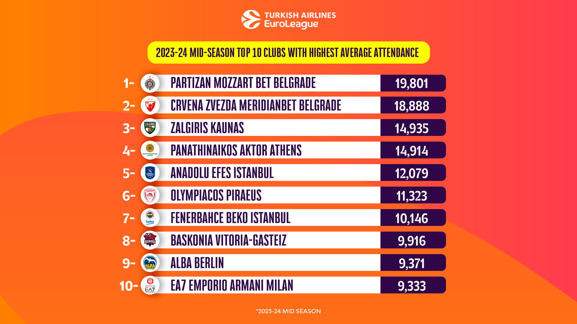 Nothing beats the atmosphere and the elite-level play seen at a Turkish Airlines EuroLeague basketball game, with record crowds across the league showing just how popular the league has become. Now in its 24th season, the EuroLeague is filled with incredibly talented players and coaches, as well as the best fan bases in the world. All of this together has caused fans – new and old – to flock to arenas in historic numbers. Attendance numbers continue to skyrocket The passion of a EuroLeague game is reverberated around the world, and more fans than ever want to be a part of the action. This season alone has seen a 17.4% jump in attendances through the first 17 rounds, with a record-best average crowd of 10,296 fans at each EuroLeague game. Compared to last season, that is a rise of 1,525 spectators per game. Looking at the overall totals, 1,462,034 fans came to regular-season games between Rounds 1 and 17, which is 128,876 more than the same period last season. This comes despite Maccabi Playtika Tel Aviv – a team which averaged 10,460 fans at Menora Mivtachim Arena – playing all bar one of its home games behind closed doors. There are six teams averaging at least 90% capacity in their arenas, too: Partizan Mozzart Bet Belgrade (99%), Zalgiris Kaunas (97%), Crvena Zvezda Meridianbet Belgrade (95%), FC Bayern Munich (95%), Olympiacos Piraeus (93%), and LDLC ASVEL Villeurbanne (92%). Their fans’ overwhelming support leads to wonderful atmospheres at the clubs’ respective arenas. The same can be said for the seven clubs who have averaged at least 10,000 fans per game, with these teams being: Partizan (19,801), Crvena Zvezda (18,888), Zalgiris (14,935), Panathinaikos AKTOR Athens (14,914), Anadolu Efes Istanbul (12,079), Olympiacos (11,323), and Fenerbahce Beko Istanbul (10,146).