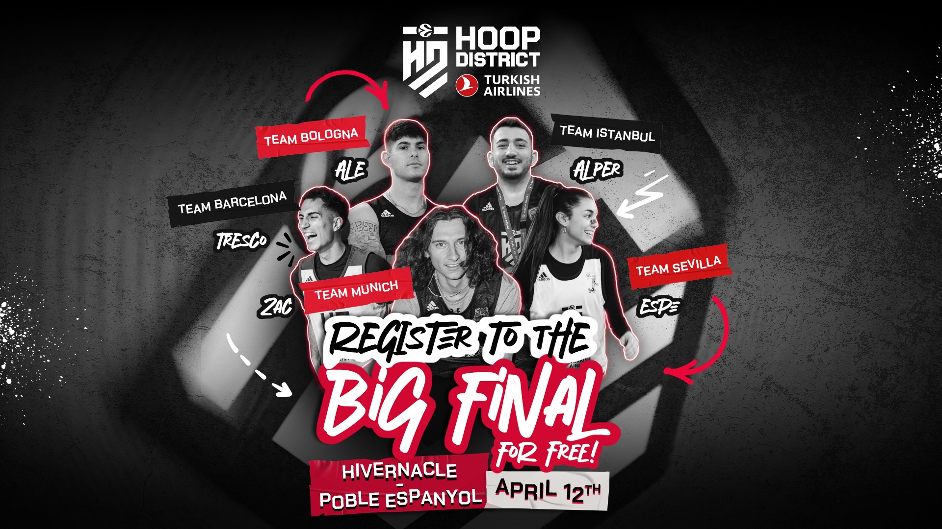 After two epic Qualifier Events in Bologna and Athens, Hoop District – the basketball competition featuring top European creators, presented by Turkish Airlines – will finally have its champion crowned at the Final in Barcelona! The event, which will also be seasoned with a blend of entertainment, live DJs and plenty of surprises, will be FREE to attend (with limited capacity) and will take place on April 12 at Hivernacle - Poble Espanyol from 17:00 to 22:00 CEST.