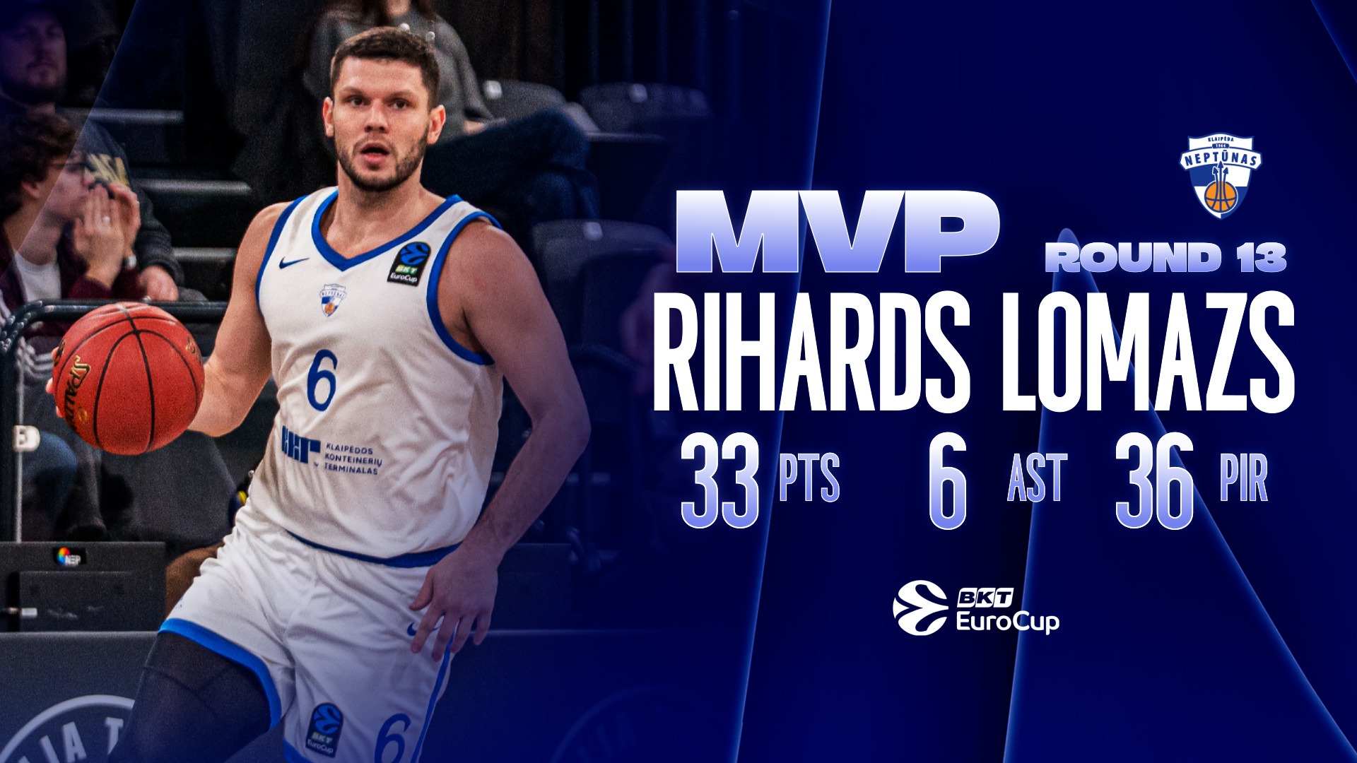 A career-best night in a winning effort saw Rihards Lomazs of Neptunas Klaipeda secure MVP honors for Round 13 of the 2025-26 BKT EuroCup season.
