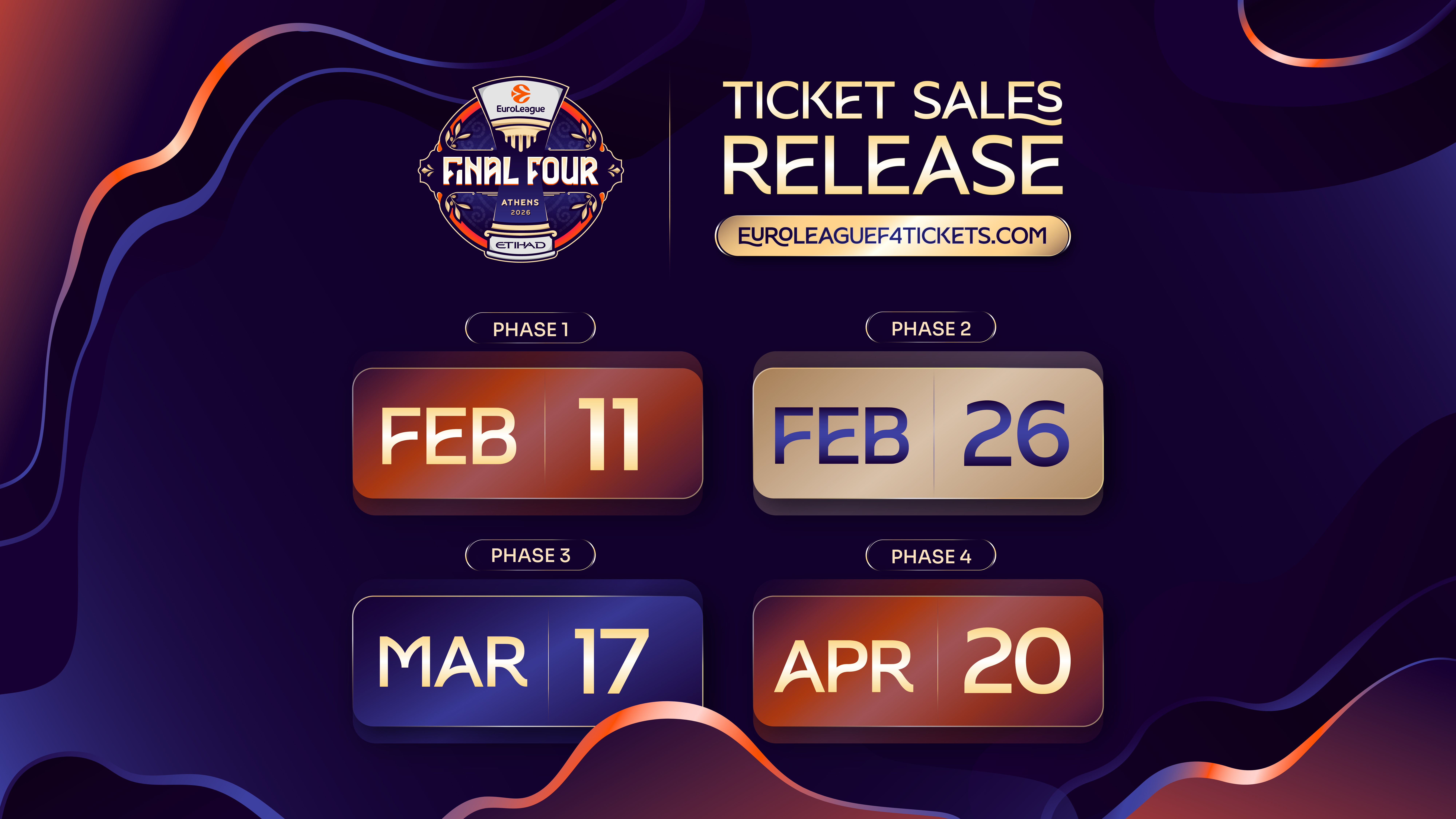 Watch the 2026 EuroLeague Final Four Athens Presented by Etihad ticket sales video promo from HERE Euroleague Basketball has announced that ticket sales for the 2026 EuroLeague Final Four Athens Presented by Etihad will begin on Wednesday, February 11, 2026. The 2026 EuroLeague Final Four Semifinals will take place on Friday, May 22 at 18:00 and 21:00 Local Times (17:00, 20:00 CEST), while the Championship Game will tip off on Sunday, May 24 at 21:00 Local Time (20:00 CEST). Fans who secure tickets will also enjoy access to the adidas NextGen EuroLeague Championship game (18:00 Local Time, 17:00 CEST), which will replace the traditional third-place game at Telekom Center Athens before the EuroLeague Championship Game. For the first time, and in anticipation of exceptionally high demand, Final Four tickets will be released in four public phases. Each phase will feature a limited allocation of tickets across multiple price categories, giving fans several opportunities to purchase and ensuring broader access.