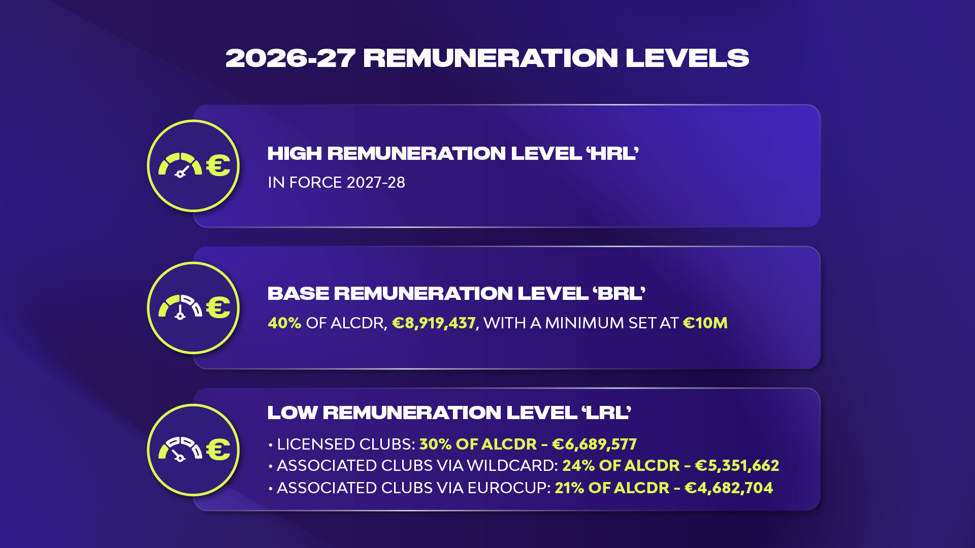 The ALCDR represents a 14% increase compared to the previous season’s indicator, €19,489,944, reflecting the business growth of EuroLeague licensed clubs across key commercial verticals accelerated by the growing strength and maturity of the EuroLeague ecosystem, which actively enhances business performance by driving sustainable commercial expansion, reinforcing collective growth, and creating an increasingly solid commercial framework for its clubs. Remuneration Levels for 2026–27 Season The Low, Base, and High Remuneration Levels, calculated as a percentage of the ALCDR, will include the following parameters for the 2026–27 season: